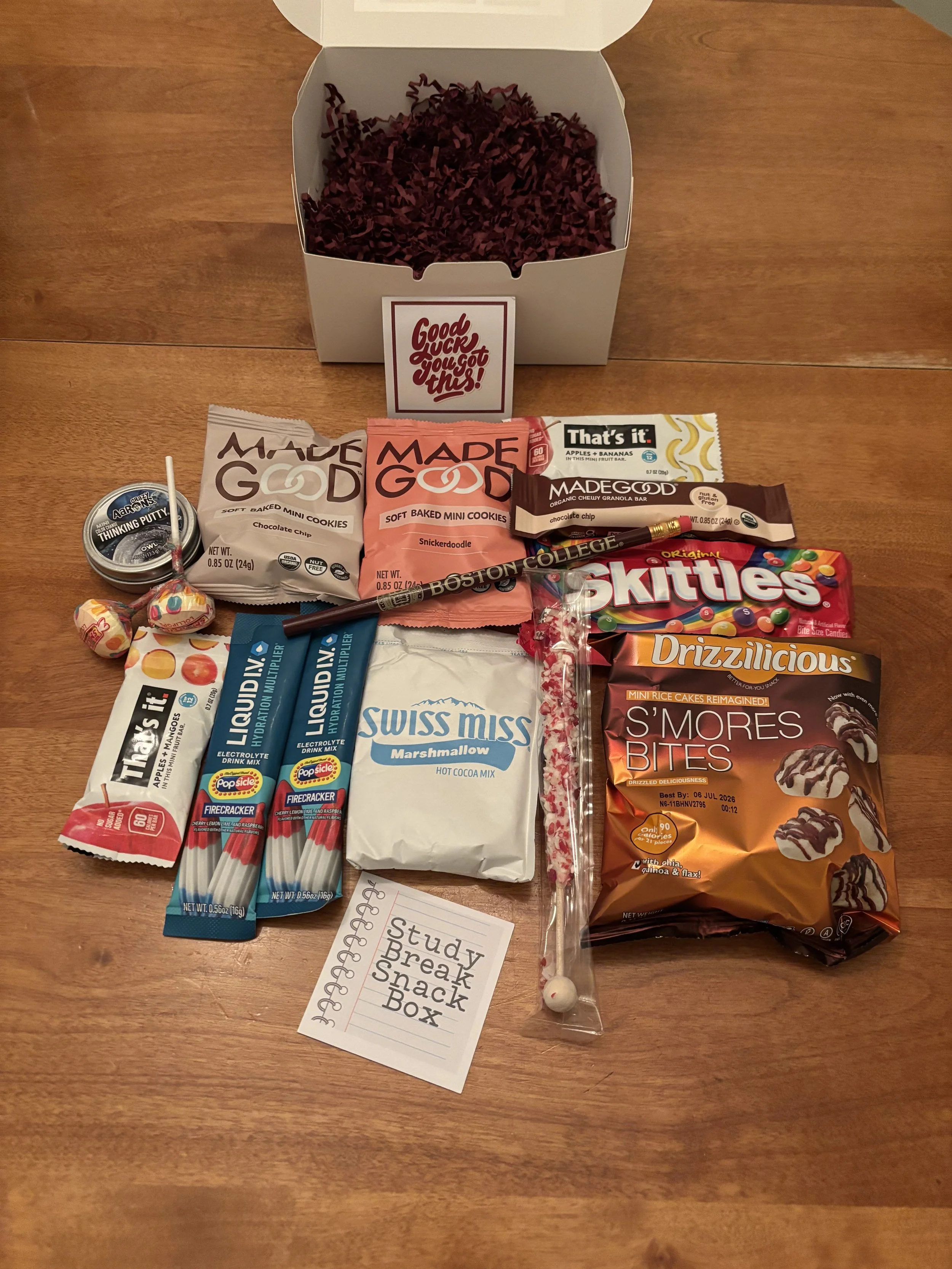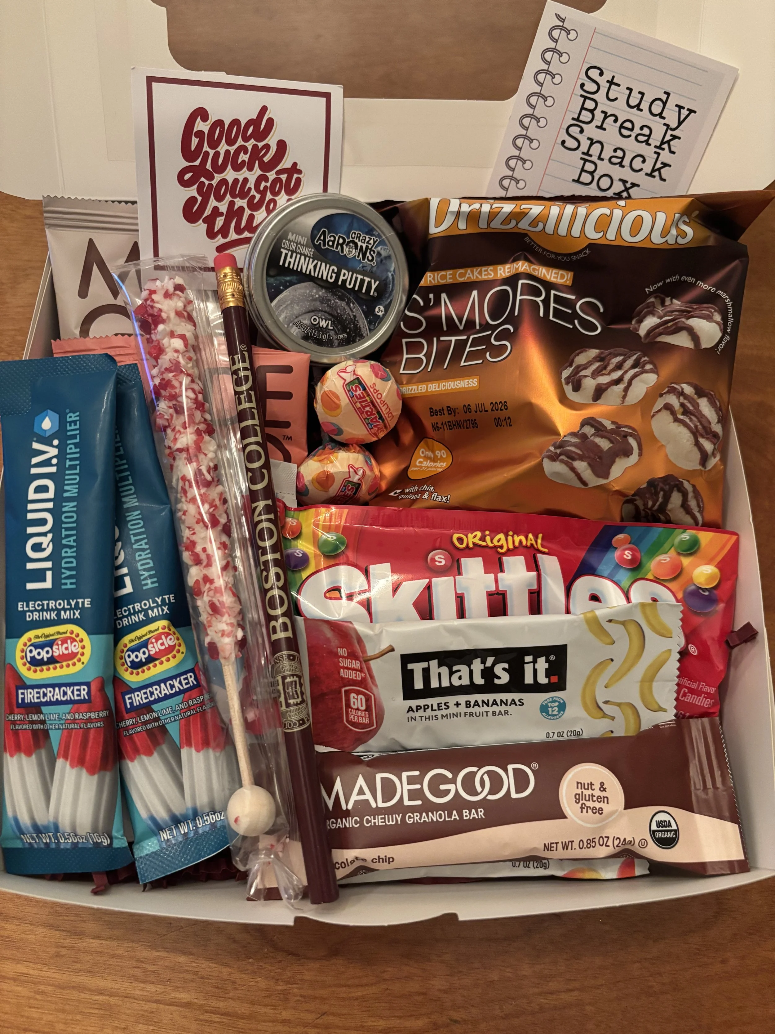 Your student must be available to meet up on campus on Sunday, December 7th between 12pm-2pm OR on Tuesday, December 9th between 3pm-5pm. Main Campus and Newton Campus deliveries will be made. Curated by Kate will work with your student via text to arrange delivery during those windows. Curated by Kate does not have access to the inside of school buildings, including dorms. Curbside deliveries will be made.